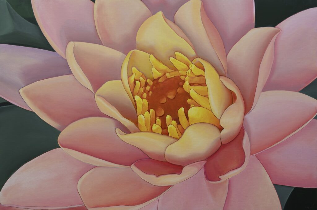 Gros plan sur une fleur de nénuphar cuivrée s’épanouissant comme un lampion dans la pénombre. Son cœur jaune tel une anémone de mer semble irradier une faible lueur. La transition entre étamines et pétales est indécise et toute sa surface est lisse et immaculée : on dirait de la porcelaine ! Cette toile explore les variations de teintes pastel entre jaune et rose dans une série de dégradés très subtils.