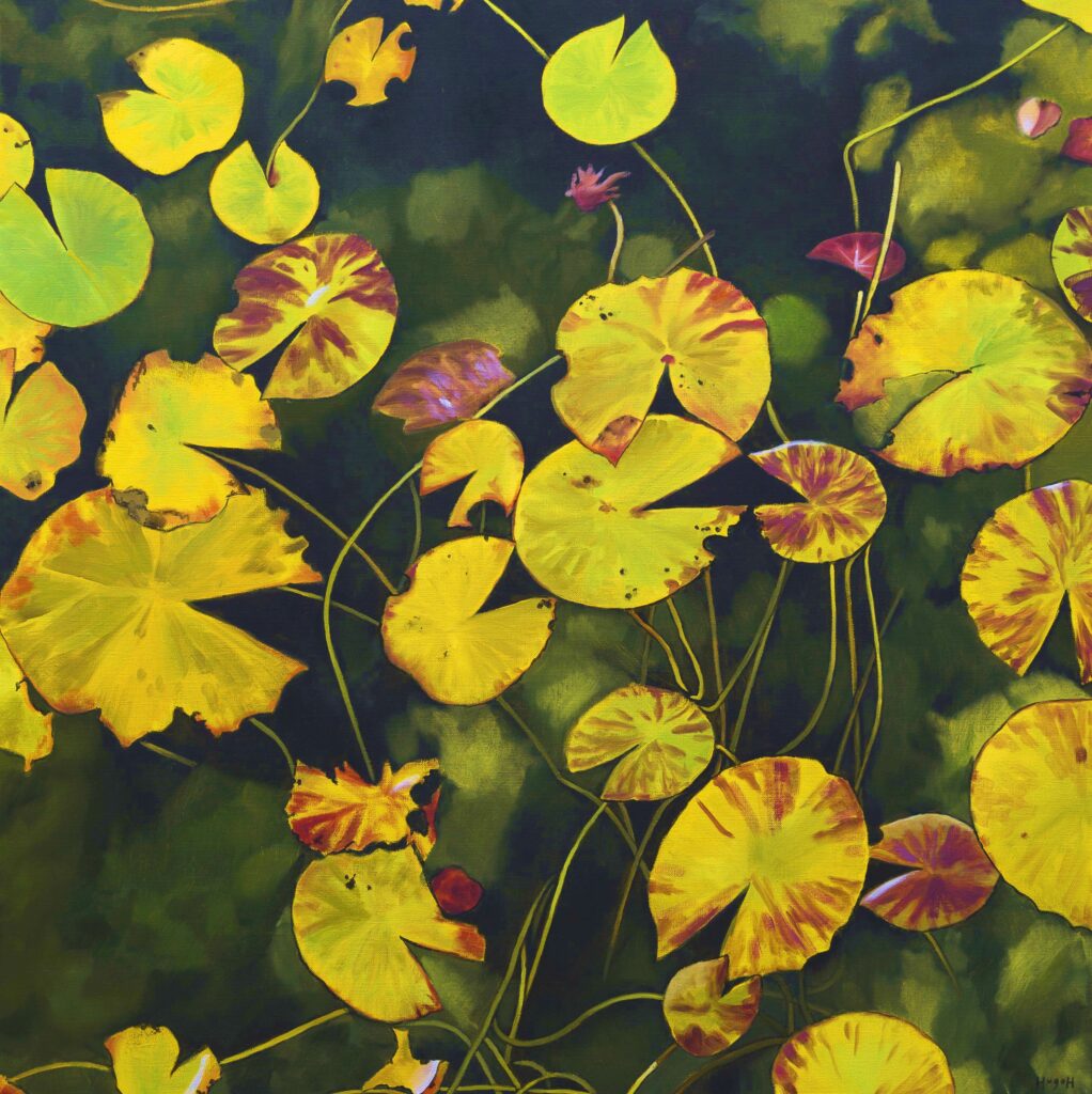 De nombreuses feuilles de nénuphar créent un tapis ajouré, établissant un motif où l’organisation de la plante pour la conquête de la surface devient palpable, sinon compréhensible. C’est un tableau-texture. Si les lignes du dessin sont précises, les surfaces ont été travaillées à larges touches. Un jaune lumineux domine l’ensemble de ce tapis automnal, complété de vert et de rose violacé. C’est le portrait d’un nénuphar jauni par l’automne sous une lumière jaune. Les feuilles abîmées soulignent l’aspect naturel, vivant de la scène et symbolisent aussi la fuite du temps.