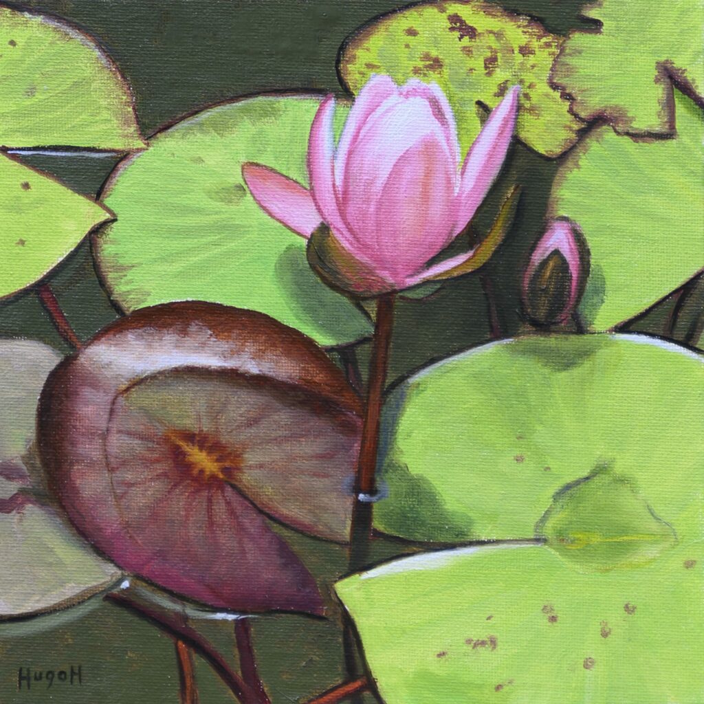 Même ambiance que le premier tableau ici mais les lotus clairsemés laissent place à une étendue de feuilles de nénuphars d’un vert nuancé. Des boutons floraux se sont érigés et parsèmeront bientôt la scène de délicates étoiles roses. La surface de l’eau reflète un ciel couvert et les rares ombres naissent de quelques feuilles quittant l’horizontale du plan de flottaison.