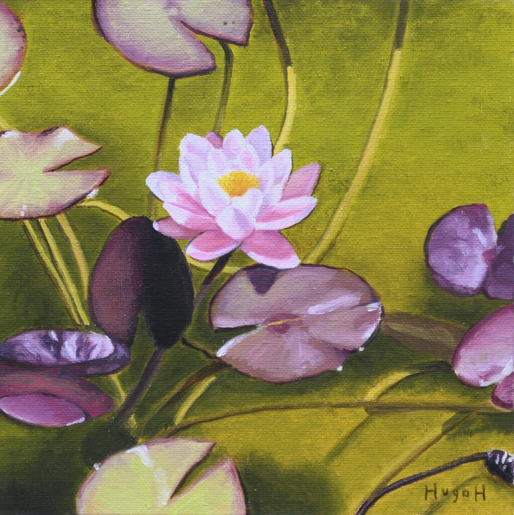 Un soleil de plomb illumine jusqu’au fond mousseux du bassin à travers une eau limpide. Deux analogies complémentaires (rose-violacé / jaune-vert) s’opposent dans ce tableau aux contrastes saisissants.