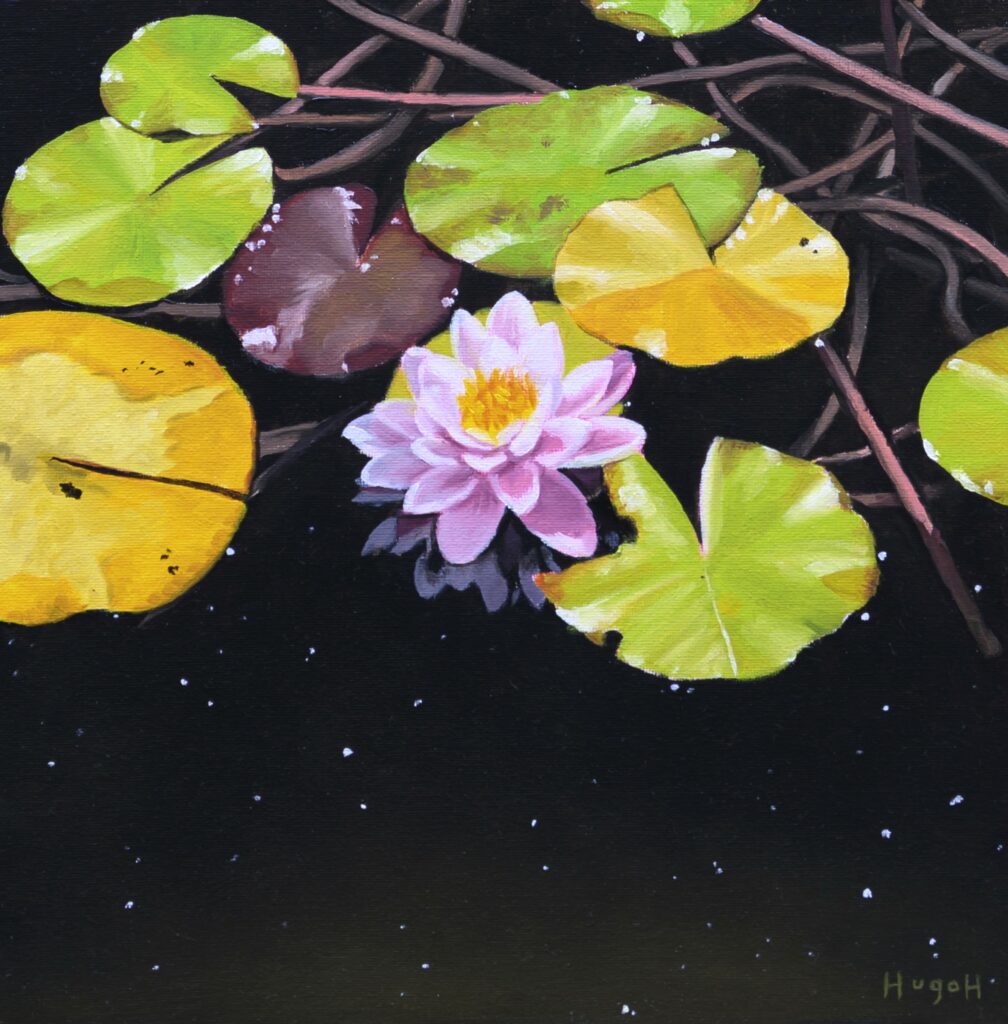 Un nénuphar aux couleurs éclatantes s’étend sur une masse d’eau si sombre qu’elle évoque la nuit. La surface sans brillance n’est perçue que par le reflet de la fleur et la multitude de petites bulles créant des éclats lumineux tels des étoiles. Le fond du bassin n’apparaît que par une légère lueur au premier plan, suggérant le halo anthropique que les astronomes appellent « pollution lumineuse » à l’horizon d’un ciel nocturne. L’eau a capturé la nuit pour y faire flotter la constellation d’un nénuphar !