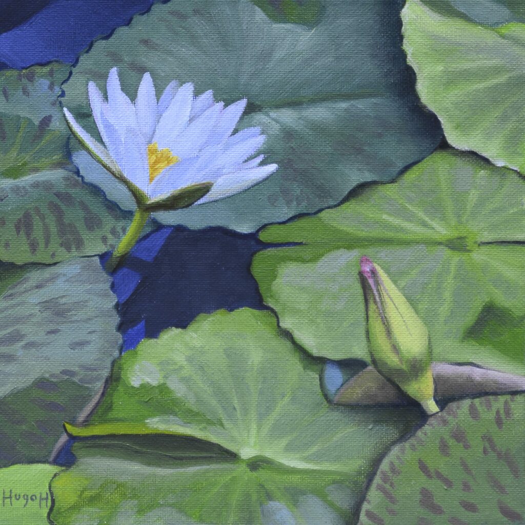 Dans la fraîcheur d’une zone abritée sous les arbres, deux nénuphars hissent leur floraison hors de l’eau. L’atmosphère ombragée est rendue à travers l’omniprésence du bleu outremer, renforcée dans le reflet du ciel à la surface de l’eau.