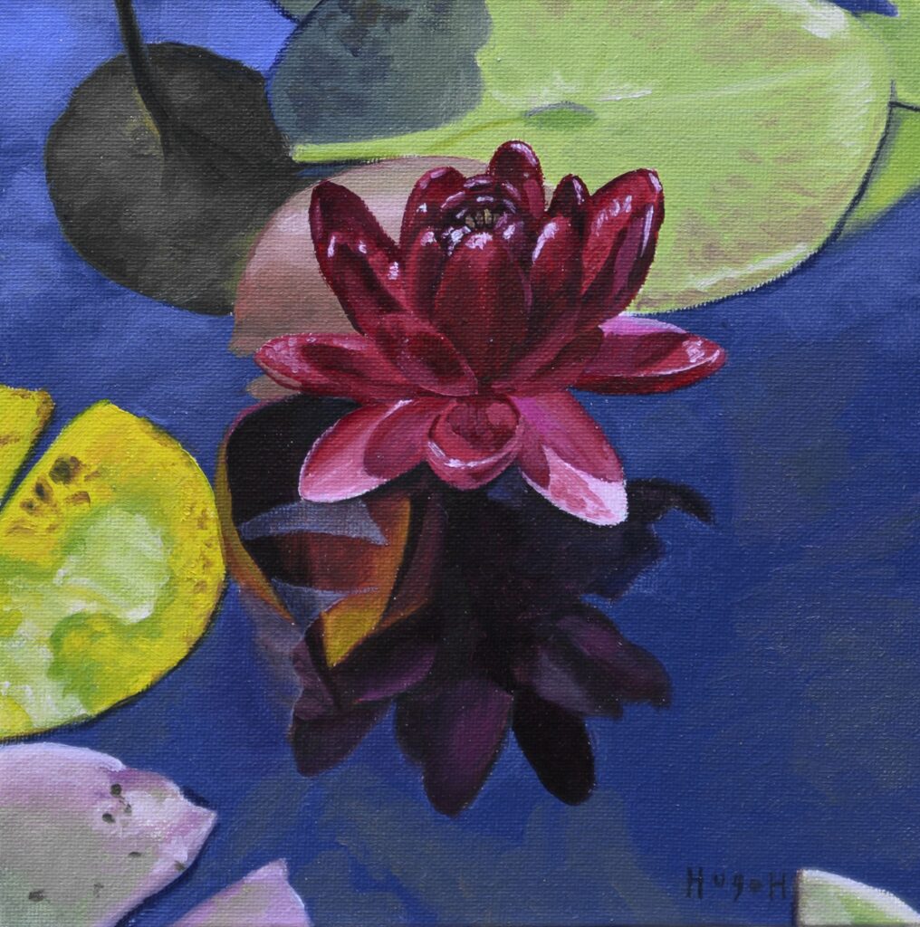 Une fleur de nénuphar s’épanouit au crépuscule dans une faible luminosité qui renforce son éclat rose, ses pétales translucides diffusant la lumière qui commence à décliner. Elle se maintient par magie à la surface immobile d’une eau limpide. L’ambiance feutrée de ce tableau est régie par une lumière bleue dans une analogie de teintes autour du violet, avec de faibles accents jaunes/verts.