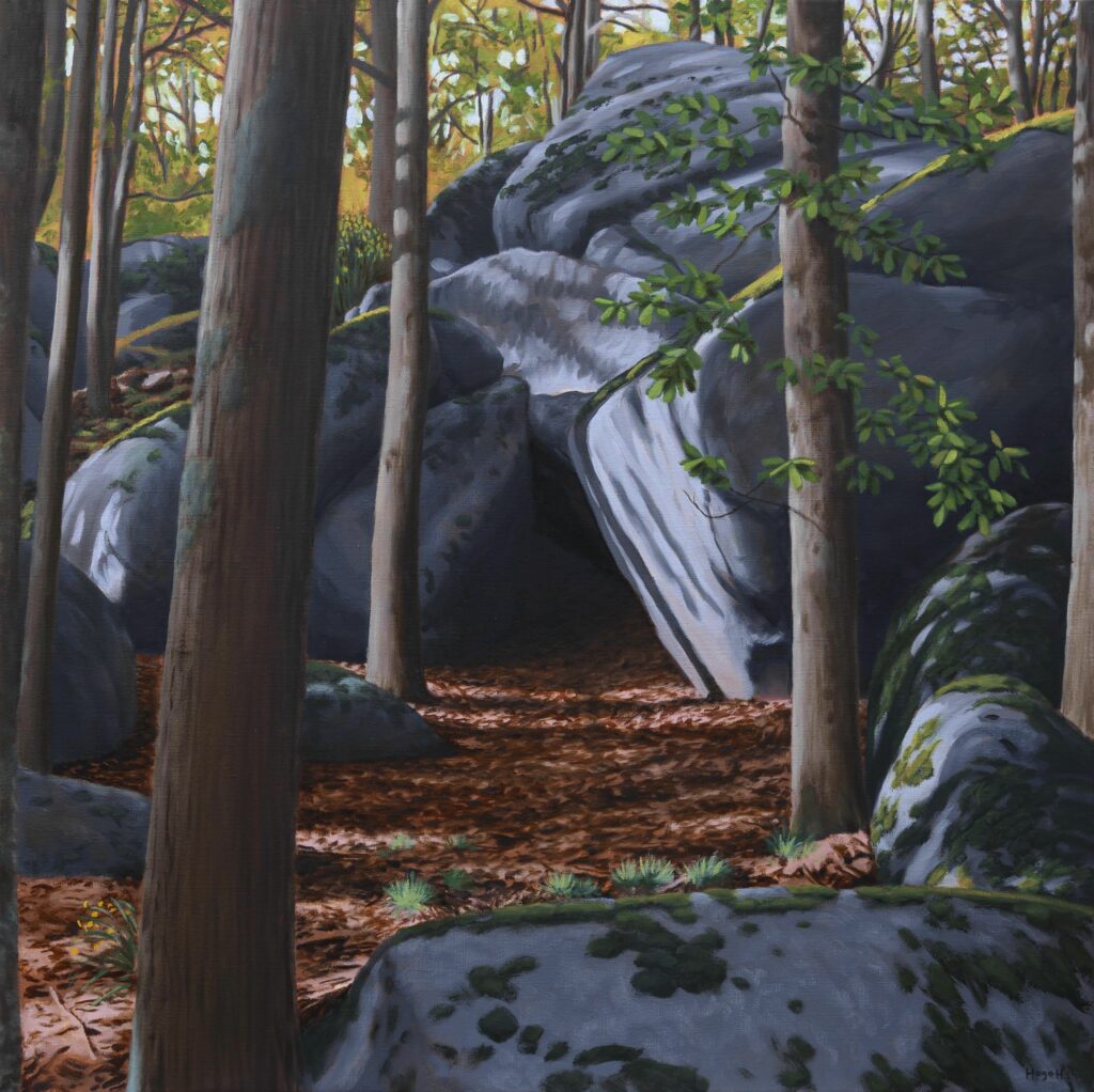 Sous les arbres de cette forêt des Hautes Pyrénées, ombre et lumière alternent sur le sol aux rochers moussus. Au loin, une clairière ensoleillée nous invite à la déambulation. Toutes les nuances des troncs et branchages sont obtenues en mélangeant la terre de Sienne du sol au bleu outremer des ombres. Le jaune apporte la lumière et permet de créer toute la gamme de verdure. Ici, nous sommes dans la peau d’un ours des Pyrénées qui parcourt son domaine en été.